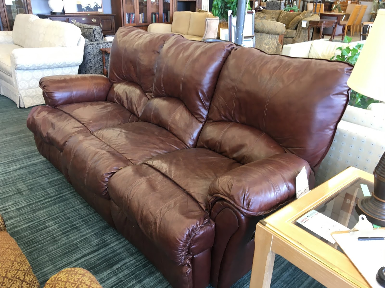 this leather (wherever the body touches) and pleather (everywhere else) sofa has a recliner on each end! It's a wall hugger (so when reclined the recliner moves forward instead of hitting the wall). The filler has bunched up in a couple of places (my last photo is trying to show you where it's clumped in the foot rest) and there are some marks but, overall, in fine condition and priced $125