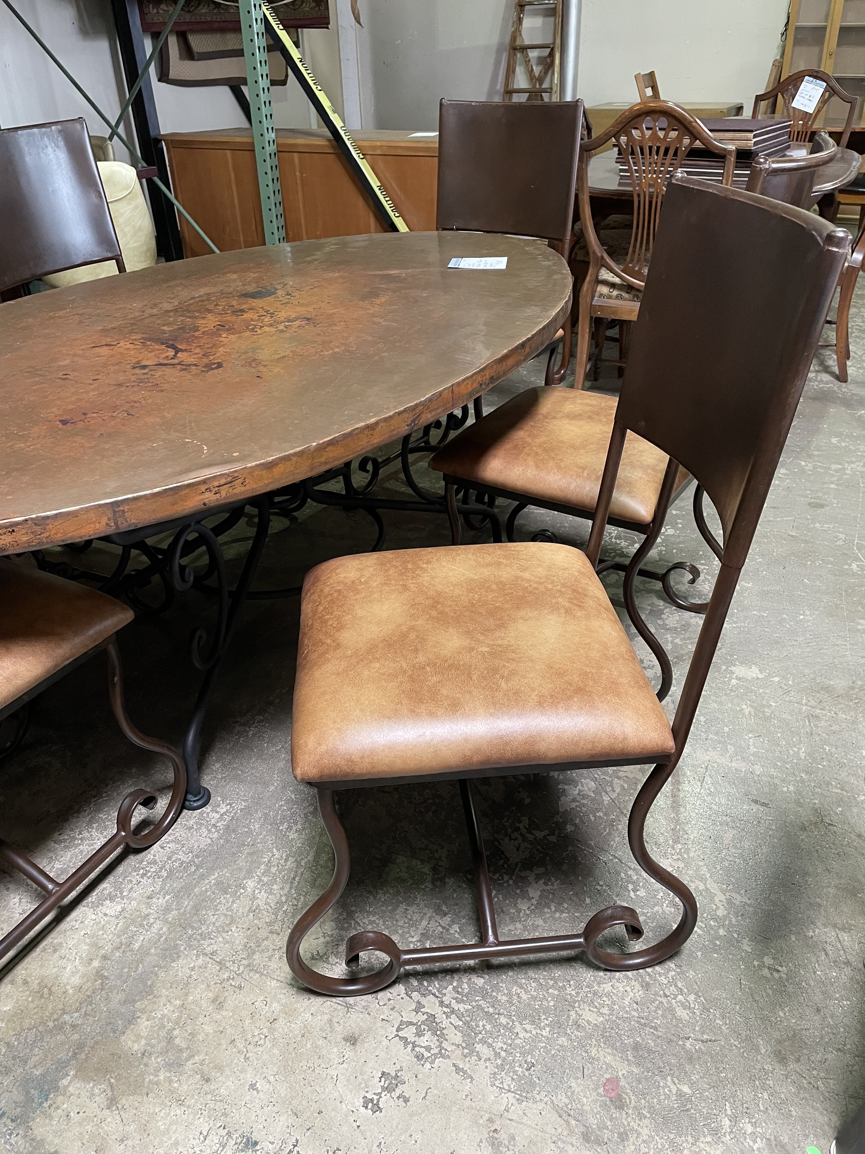 oh man - we're starting with such a cool piece! COOPER top dining table (measures: 45 1/2" wide and is 78" long) with six chairs! We're not 100% sure this set was purchased together (though was donated together) because the metal on the base of the table and the metal on the chairs have a different finish but, wee doggies - this is an amazing set! Chairs are very comfortable and you can see the cooper has a gorgeous patina (and some marks from use). Priced $745 for the set